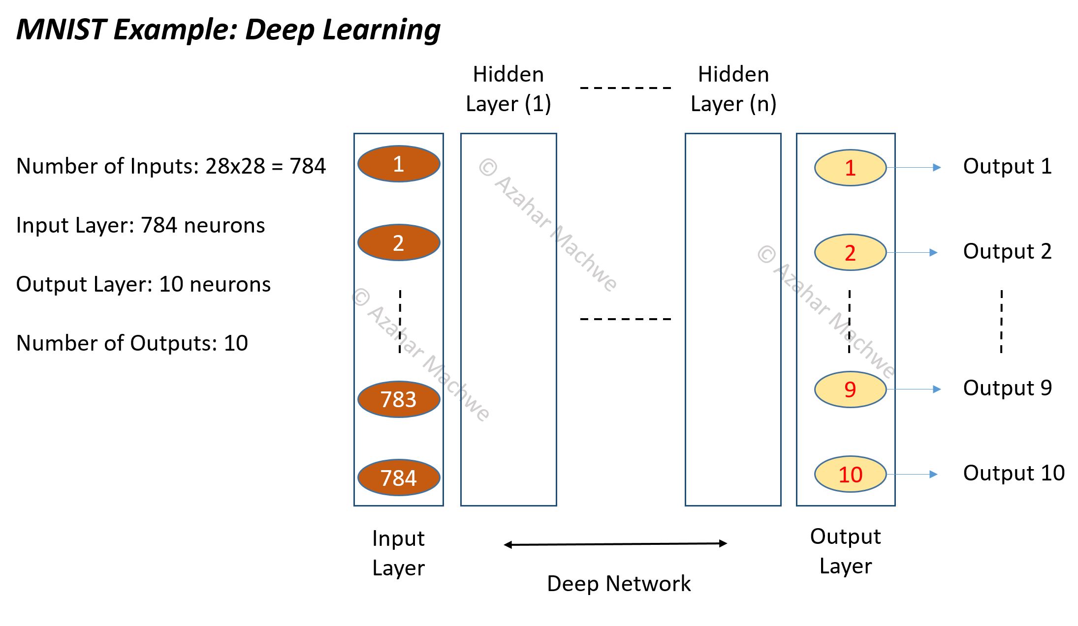 Image above shows a deep learning network setup for the MNIST data set where inputs are gray-scale images (of constant pixel count 28×28) of single handwritten digits (0 to 9) which need to be mapped to their corresponding number. Each pixel in the 28×28 image is normalised and treated as an input. This gives us a full input length of 784 neurons. There are 10 digits (0 to 9) as a possible output class so the full output length is 10.