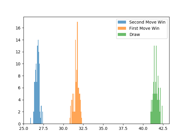 This time we see that there is high chance of a draw (~ 42%), first movers still win more than second movers but the difference is less dramatic (~ 31% for first movers and ~ 26% for second movers). We also see that the first and second mover distributions are starting to overlap at the edges.