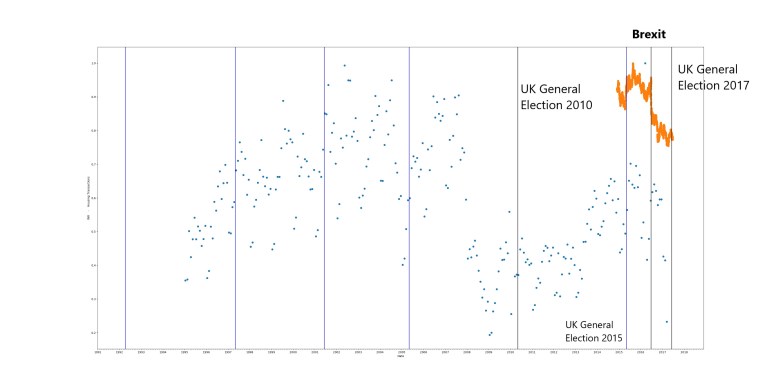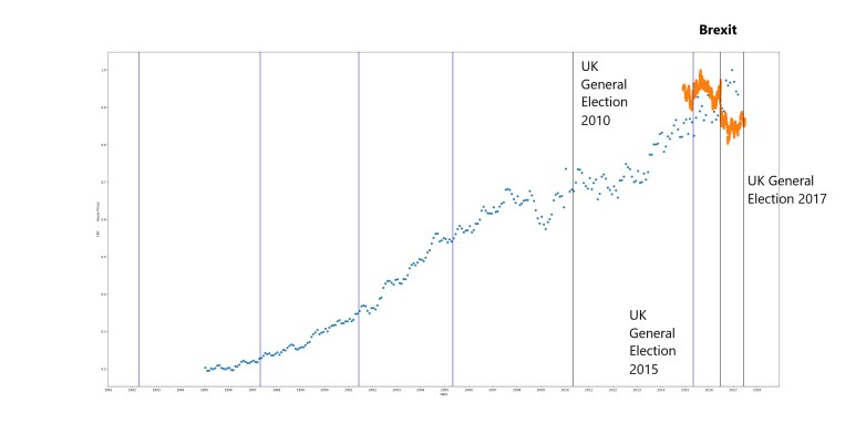 The vertical lines represent UK general elections with blue representing clear results (clear majority) and black lines representing hung Parliament. There is a black line (2nd from right) that represents EU Referendum (‘Brexit’).