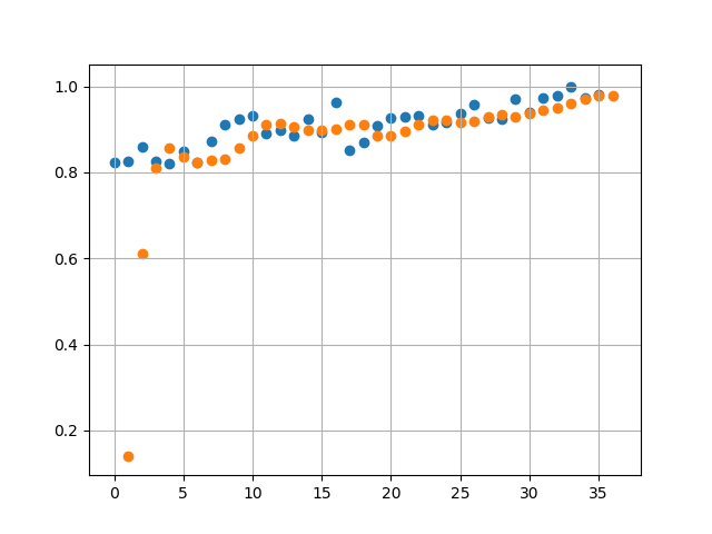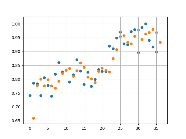 Orange dots represent the prediction by the RNN and Blue dots represent the actual data