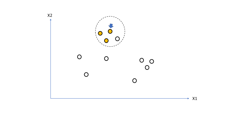 We take the first point in the seed set (marked by the blue arrow) [line 40] and mark it as a point belonging the current cluster (orange) [line 48] then we identify its neighbourhood [line 49]. This is shown in Figure 4.