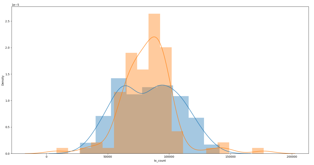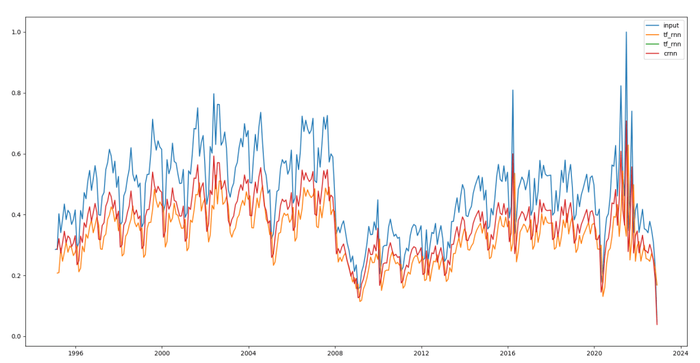 More sophisticated methods such as RNNs will product very different output. We can see in Figure 3 how RNNs model the transaction data. This is just to model the data not doing any forecasting yet. The red line in Figure 3 is a custom RNN implementation and the orange line is Tensorflow RNN implementation.