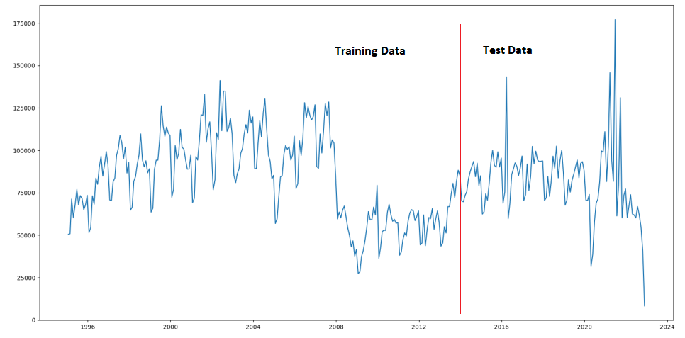 In the previous post we built a simple time-series forecasting model using a custom neural network model as well as a SARIMAX model from Statsmodels TSA library. The data we used was the monthly house sales transaction counts. Training data was from 1995 – 2015 and the test data was from 2016 – end 2022.
