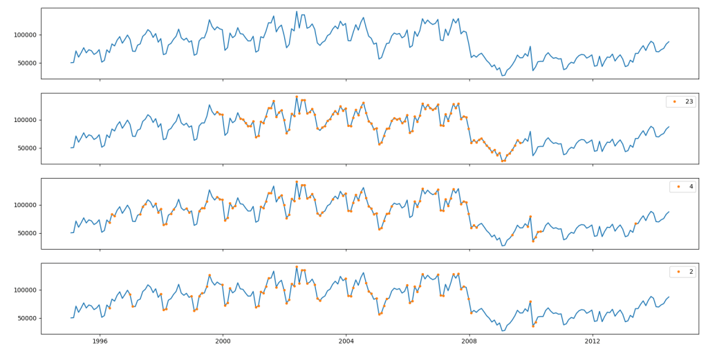 As we decrease the chunk size we see less points are collected. Smaller the chunk size more variability will be needed in the neighborhood for the central point to be sampled. For example for chunk size of two (which mean two points either side of the central point – see Figure 4), we find sampling from areas of major changes in transaction counts.