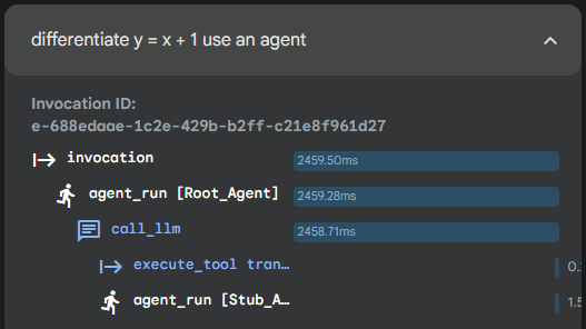 When you run the above as a sub-agent to the root agent this is what the interaction and trace looks like:
