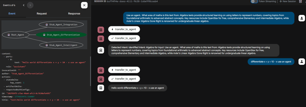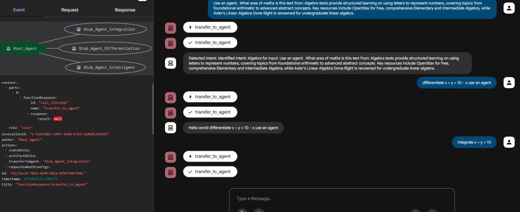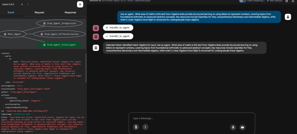 class IntelligentStubAgent(BaseAgent): model: SentenceTransformer = SentenceTransformer('all-MiniLM-L6-v2') key_intents: list[str] = ["Integration", "Differentiation", "Algebra", "Geometry", "Trigonometry"] encoded_intents: list[np.ndarray] = [] def __init__(self, name: str, description: str, sub_agents=[]): super().__init__(name=name, description=description) self.encoded_intents = [self.model.encode(intent) for intent in self.key_intents] override async def _run_async_impl(self, ctx: InvocationContext) -> AsyncGenerator[Event, None]: # Get the input message from the context logger.info(f"{self.name} received context: {ctx}") input_message = ctx.user_content.parts[0].text if ctx.user_content and ctx.user_content.parts else "" print(f"Received input message: {input_message}") # encode incoming message for similarity search encode = self.model.encode(input_message) # Just to simulate some processing # generate similarity score and select best intent similarities = [1 - util.cos_sim(encode, intent) for intent in self.encoded_intents] best_intent_index = np.argmin(similarities) best_intent = self.key_intents[best_intent_index] modified_message = f"Identified intent: {best_intent} for input: {input_message}" event = build_event( name=self.name, content=f"Detected intent: {modified_message}", state_delta={"identified_intent": best_intent}) yield event# Nothing to see here - helper method to build an event object.def build_event(name:str, content:str, turn_complete:bool=False, transfer_to_agent:str=None, state_delta:dict={})->Event: action = EventActions(state_delta=state_delta, transfer_to_agent=transfer_to_agent) invocation_id = f"{name}-{random.randint(1, 99999)}" event = Event( invocation_id=invocation_id, author=name, content = Content(role="assistant", parts=[Part(text=content)]), actions=action, turn_complete=turn_complete) return event
