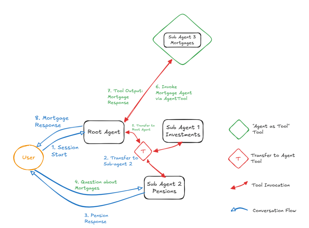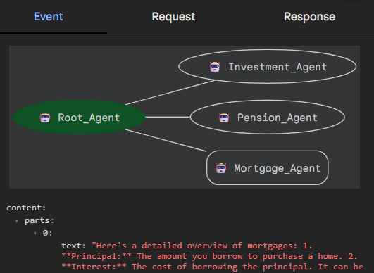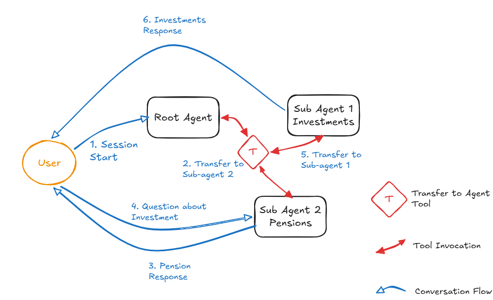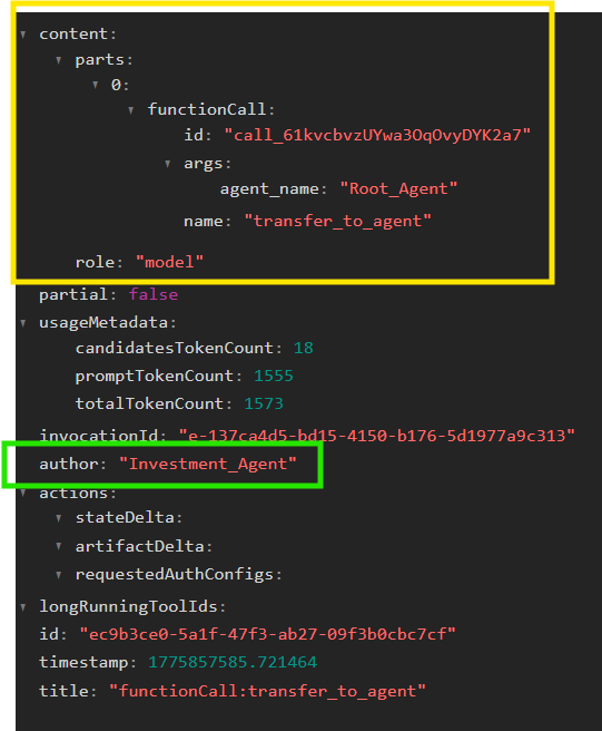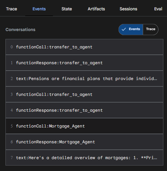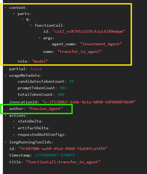 In the event traces below you can see the Pension Agent (sub_agent2) transferring to Investment Agent (sub_agent1) by invoking the transfer_to_agent function using the sub_agent1’s name value. And sub_agent1 transferring to the root agent.