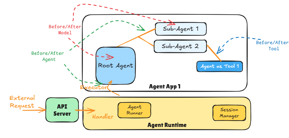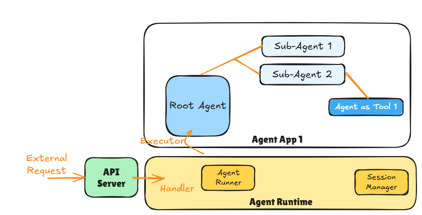 2. Manages the Agent Runner which executes the Agent App 1 by triggering its Root Agent.