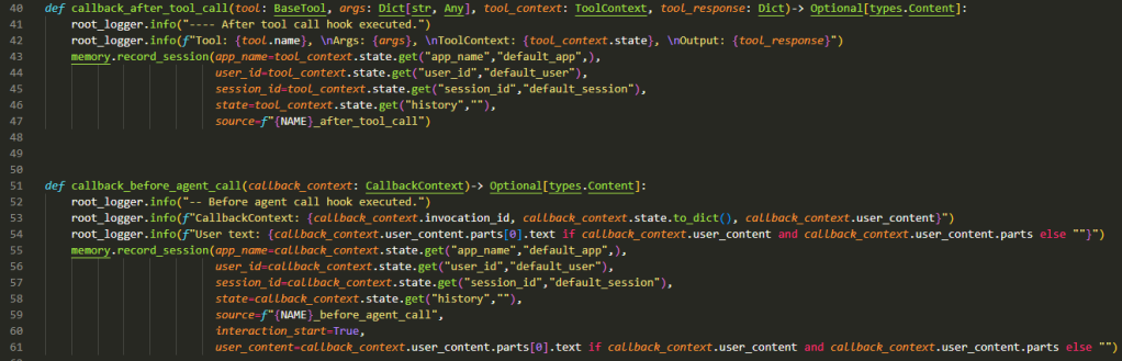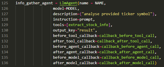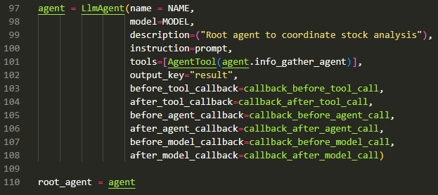 Then come the callbacks (Lines 103-108) that allow us to track the flow of the Agent application. There are six types of callbacks and between them they tap the strategic points in the Agent-Agent and Agent-Tool flows.