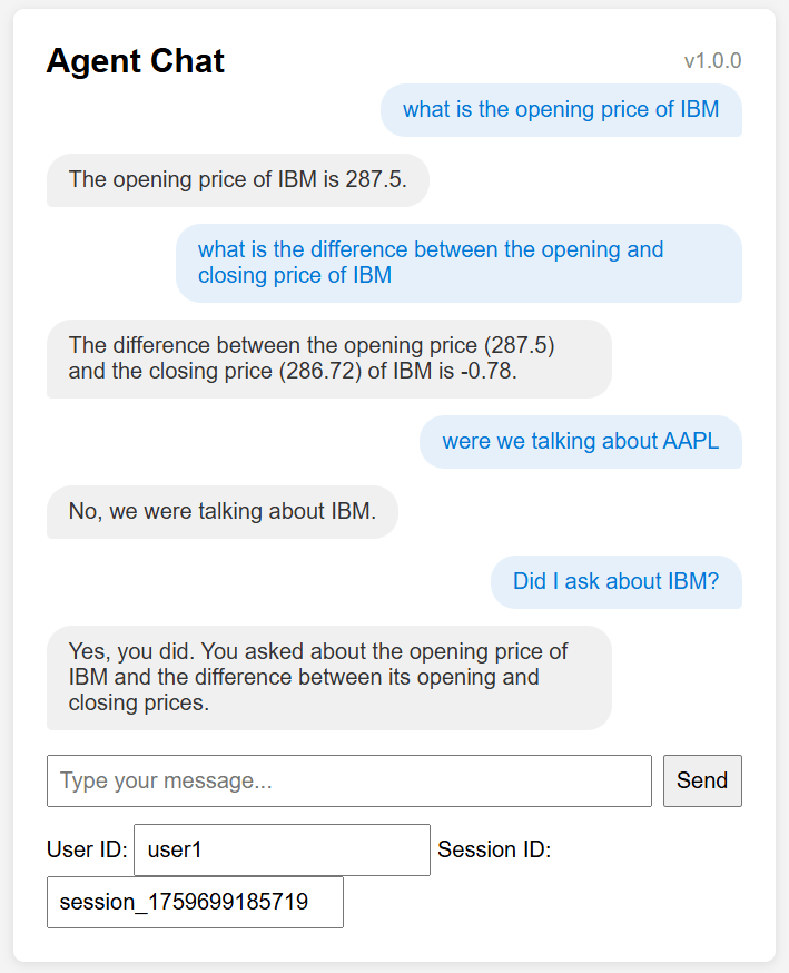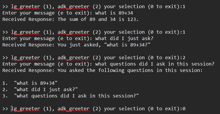In the test above you can see how when we ask a question to the lg_greeter agent it then remembers what was asked. Since the memory is handled at the Agent Runner level and is keyed by the user id and the session id it is retained across agent interactions. Therefore, the other agent (adk_greeter) has access to the same set of memories.