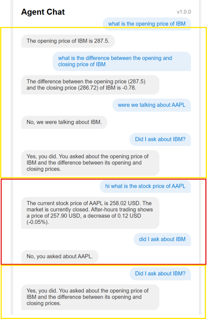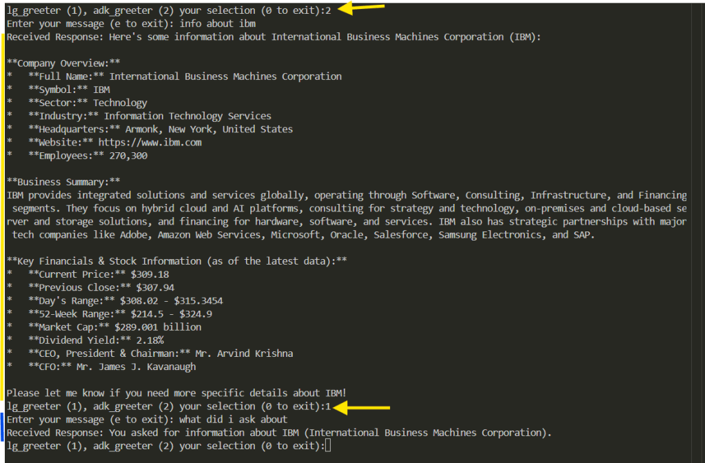I next added a stock info tool to the ADK agent (because LangGraph agent running on Phi-4 is less performant). The image below shows the output where I ask ADK (Gemini) for info on IBM and it uses the tool to fetch it from yfinance. This is shown by the yellow arrow towards the top.