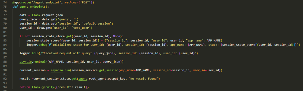 Line 88 is where the Agent Runtime is triggered in an async manner with the Application Name, User Id, Session Id, and the Query. The Application Name is important in case we have multiple Agentic Applications being hosted by the same Agent Runner. We would then have to change the session store to also be indexed by the App Name.