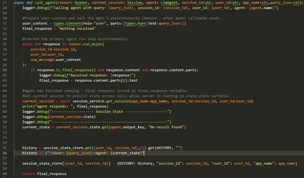 The main method (Line 62 onwards in the above – invoked on Line 88 in previous listing) represents the Agent Runtime (e.g., Agent Engine in GCP) triggering the agents it is hosting (Agent App 1). It is taking the App Name, Session Id, User Id, and the incoming Query as described previously.