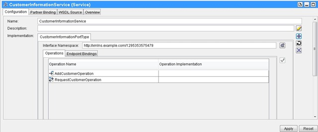 The Service resource should contain a whole lot of new stuff now (see screenshot below). In Configuration tab, the Implementation will have two tabs: Operations and Endpoint Bindings.