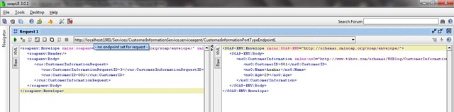 We shall use SOAP UI (free edition) to test the TIBCO web-service. We setup a new SOAP UI project with a local copy of the WSDL file. SOAP UI creates test requests for the web-service as a part of the project setup.