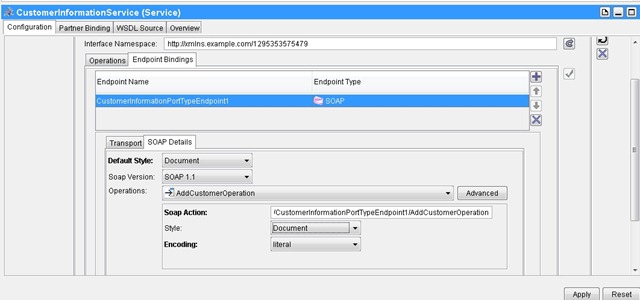Next move to the SOAP Details tab. Define the default service style (document or RPC – in present example document) and the styles and encoding for the different operations within the service (in our case document – literal). You can set style to ‘Use Default Style’ to make your life easier in case of multiple operations.