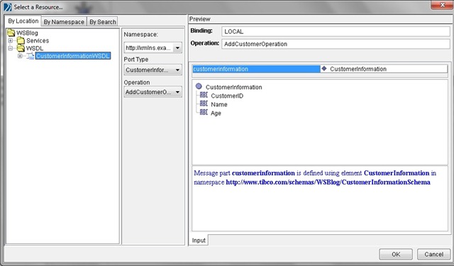 Create a new WSDL resource and double-click it. Add two new Messages: CustomerInformationRequest and CustomerInformation. The output message for the retrieve information operation has the same schema as the input for the add information operation.