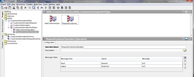 In the RequestCustomer operation configuration, add an input message with message schema set to CustomerInformationRequest and the output message with message schema set to CustomerInformation.