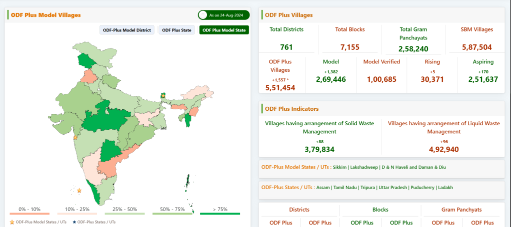 In the dashboard above ODF Plus Village/District/State is one that has maintained their open defecation free (ODF) status and has arrangements for solid and liquid waste management.
